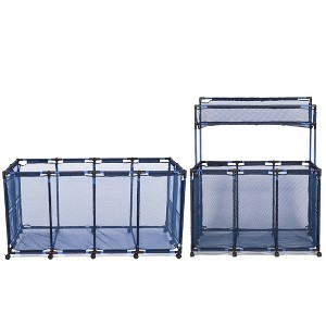 Features:- Portability & Wide Application - This mesh pool storage bin kit includes a 2-tier storage cart measuring 49 7/16" x 30 1/2" x 61" in size and a 65"x30"x33" storage cart for keeping pool noodles, swimming rings, balls and other accessories- 2-Tier Basket - Comes with 33Lbs weight capacity for providing spacious space for storing large inflatable toys, floats and more, along with side pockets for keeping goggles and towels in place, also comes with a top noodle holder for pool noodles and long items, saving more space and allowing easy access- 1-Tier Basket - Large rolling cart features 63.5 Lbs weight capacity for organizing all your pool toys easily, and comes with 12 wheels for smooth movement in every direction, and 6 of them are lockable for stability, allowing you to push along to pick up pool toys, equipment and accessories- Mesh Hollow Design - Features polyester mesh fabric which is breathable for better air circulation and effective water draining, enabling quick drying pool toys and accessories for avoiding chlorine odor and fungal growth- Durable Construction & Easy Installation - Features sturdy metal tubes with powder coating for resistance against rust, wear-and-tear and scratches, ensuring a long lifespan; comes with mounting accessories for easy DIY installationSpecifications:- 2-Tier Basket:- Overall Dimension(LxWxH): 49 7/16" x 30 1/2" x 61"- Side Pocket Size: 13 3/4" x 11 13/16"- Net Weight: 16.4 Lbs - 1-Tier Basket:- Overall Dimension(LxWxH): 64 15/16" x 30 5/16" x 33 1/4"- Side Pocket Dimension: 13 3/4" x 11 13/16"- Net Weight: 14.3 LbsPackage Contents:- 2-Tier Basket:- 50x Tubes- 4x Corner Connectors- 6x T-Shape Connectors- 6x 3-way Connectors- 4x 4-way Connectors- 10x Wheels- 2x Mesh Cloths- 1x Wrench- 1-Tier Basket:- 1x Mesh Net- 12x Wheels