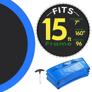 Features:- Trampoline Mat- Replace & Reuse - This Trampoline Replacement Mat is specifically designed for 15 ft round trampoline frames with 96 v-rings and 7" springs, allowing you to replace your worn-out or damaged trampoline mats and renew your existing trampoline without buying a new trampoline frame- Durable - Made of strong polypropylene fabric, which is both UV and fade-resistant, ensuring enhanced durability and a long lifespan, ideal for outdoor use in gardens and backyards- Extra Stable - Features 8-row stitching for extra strength and stability, ensuring safe usage even under heavy force and pressure, allowing for use by multiple individuals at the same time- Trampoline Pad- Universal Replacement - This Round Trampoline Safety Pad is suitable for 15 ft round trampolines with 6 1/2" to 8 1/4" long spring, enabling low-cost maintenance and upgrading of your old, worn-out or damaged one; Its colorful and appearance gives it a fresh look- Easy Installation & Storage - Features tool-free installation within minutes, simply lay it out flat on the trampoline and tie the bottom straps to the V-Rings and frame for simple DIY assembly- Durable - UV resistance and water resistance and easy cleaning, ensuring great durability and effortless maintenance so you do not need to worry about leaving it outdoorsSpecifications:- Trampoline Mat- Overall Dimension(LxW) 13 1/2 ft x 13 1/2 ft- Fits Trampoline Frame Diameter 15 ft- Fits Spring Length 7"- Quantity of V-ring Loops 96- Net Weight 10.9 Lbs- Trampoline Pad- Overall Dimension(Dia.xH) 180" x 9/16"- Strap Quantity 32- Net Weight 7.7 LbsPackage Contents:- 1x Trampoline Mat- 1x Trampoline Safety Pad- 1x Spring Pull Tool- 2x ManualsNotice: - Please measure the dimensions of your trampoline frame and read our description carefully for the best fit prior to your purchase.