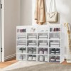 This set of 20 stackable and foldable shoe boxes brings organization and efficiency to your home. Made from lightweight PP and sturdy ABS, they are easy to assemble and collapse for space-saving storage. The transparent fronts let you quickly see and access your shoes, while the round door hole aids opening and air circulation. With ample space for most shoes and other small items, these versatile boxes can be stacked in various configurations to fit any room, helping you create a tidier, more functional space.