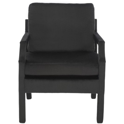 Bring sleek style and comfort to your home with our Ylva accent chair. Beautifully streamlined and tailored, our accent chair maintains the perfect balance within a plush and clean-lined design. Its tall sheltering arms and boxy cushioned seat offer a dose of comfort and style. Upholstered in fade-resistant fabric with soft velvety textures, our accent chair brings a refined touch of luxury to your home. It adorns a rich black hue to become a charming fit for your living area, bedroom, or home office.