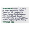 canola oil, water, distilled vinegar, egg yolk, salt, natural flavor, mustard (distilled vinegar, water, mustard seed, salt, turmeric, paprika, spices), garlic, onion, citrus fiber, ground mustard, black pepper, yeast extract, rosemary extract' '