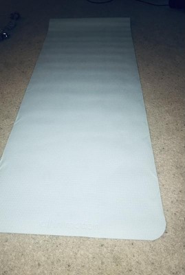 This yoga mat is super thin and not very cushiony. I was really hoping it would be a little thicker. You can see in the photo the difference in thickness between my other yoga mat (teal) and the All in Motion one. I like the light aqua color. I didn’t feel like I slipped on the mat, but haven’t brought it to a hot yoga class yet.