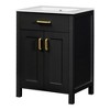 This bathroom vanity is designed to fit smaller spaces perfectly, it is a solid wood frame paired with MDF doors, side panels, and drawers that deliver reliable durability, standing up to daily use for years. Its elegant look comes from golden handles and classic aesthetics, adding a touch of sophistication that elevates your bathroom’s decor. Ample storage is provided by 2 soft-close doors with dual-tier shelving, keeping essentials like toothbrushes and toothpaste neat and easy to reach. The ceramic sink includes an overflow hole, combining stylish design with practicality to prevent spills and keep the area dry. Inside, a U-shaped adjustable shelf lets you customize storage to fit your needs, making it simple to organize items of different sizes.