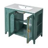 This bathroom vanity blends ample storage and timeless elegance, featuring 3 fully pull-out drawers and a large cabinet that keep skincare products, toiletries, and essentials neatly organized—enhanced by gold metal handles and a smooth surface that adds a sophisticated touch to any bathroom decor. Crafted from medium-density fiberboard (MDF) with an integrated ceramic sink, it delivers exceptional strength and stability, while the moisture-proof painted surface resists expansion, ensuring long-lasting durability even in humid bathroom environments. Its modern elegant design highlights translucent patterned glass, which maintains privacy, creates a soft glowing effect when light passes through, and adds depth and beauty to the space.