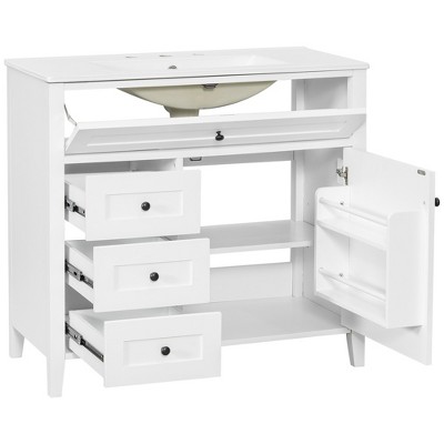 This compact 36-inch vanity masterfully combines elegant design with practical functionality for smaller bathrooms. It features a durable ceramic sink with a built-in overflow, designed to resist stains and simplify cleaning while preventing water spills. The vanity is constructed from a solid wood frame and premium MDF panels, ensuring robust support and lasting resilience. Ample and versatile storage is provided through a deep drawer, a standard drawer, and a spacious under-sink cabinet, all designed for flexible organization of bathroom essentials. The soft-close cabinet door ensures quiet, gentle operation. Adding a refined finishing touch are the elegant, corrosion-resistant gold zinc alloy handles. Designed for straightforward setup, it comes with clear instructions for an efficient two-person assembly. This vanity delivers a perfect blend of sophisticated style, intelligent storage, and enduring quality for a clutter-free bathroom.