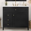 This freestanding vanity provides a perfect blend of modern style and practical storage for any bathroom. It features a sleek, glossy white finish that wipes clean effortlessly, maintaining a fresh look with minimal upkeep. The durable construction utilizes high-quality MDF and solid rubberwood legs for lasting stability. Ample and intelligent storage is delivered through a versatile dual-side layout: three drawers on the left for organized item separation and a spacious right-side cabinet featuring adjustable shelving to accommodate items of various heights. The convenient pull-out top drawer offers immediate access to daily essentials. Designed to integrate seamlessly into diverse décors, from contemporary to classic, its space-efficient footprint maximizes utility without compromising on style or durability, making it an ideal storage solution for apartments, guest bathrooms, and powder rooms.