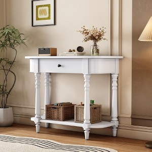 This narrow console table with a curved corner offers a perfect blend of vintage style and practical functionality. Crafted with a solid pinewood frame and legs, it features a smooth finish and elegant design elements like curved corners and intricately turned legs. The table includes a top drawer and an open shelf for convenient storage, making it ideal for entryways, hallways, and living rooms. Available in five beautiful finishes, this console table is both stylish and durable.