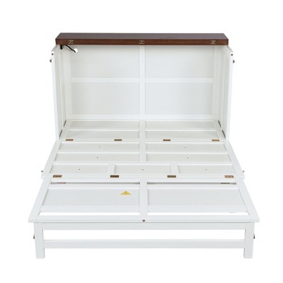 Maximize your space without sacrificing style or function with our ingenious Full-Size Murphy Cabinet Bed! This compact marvel transforms effortlessly, doubling as a spacious cabinet ideal for small rooms or frequent guests, and easily accommodates a 6-inch foldable mattress. Stay organized with the large, wheeled storage drawer, perfect for stashing bedding, clothes, toys, or books. Stay connected thanks to the integrated charging station featuring 2 power outlets and 2 USB ports for all your devices. Crafted from premium pine and composite wood with a reinforced frame and enhanced platform, it promises lasting durability and stability for lounging, movie nights, or gaming. Available in two elegant finishes, this versatile piece combines smart storage, modern convenience, and robust construction to create a truly clutter-free and functional living space.