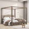 A minimalist four-poster frame, integrated headboard and washed-wood finish give this king-size canopy bed a contemporary yet timeless presence. Solid slats and center support legs provide quiet, sturdy support for any mattress, while open under-bed clearance keeps the room uncluttered.