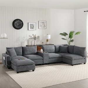Combining modern style with practical features, this modular sofa is designed to enhance both comfort and convenience in your home. The movable ottoman doubles as a spacious storage compartment, helping you keep your living area tidy. Armrests are equipped with detachable storage pockets and a built-in USB charger, so you can easily store essentials and charge your devices within reach. The multifunctional console provides additional storage and cup holders, making relaxation even more enjoyable. With an extra-wide 30'' seat and pure foam cushions, the sofa offers superior comfort and support. Its flexible modular design lets you rearrange the layout to perfectly fit your space and changing needs, making it an ideal choice for any modern living room.