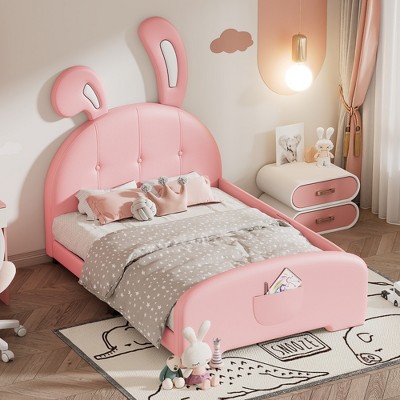 YOOCOZZ Twin Size Rubber Wood Floor Bed with Fence,Door and Safety Guardrails-Pink