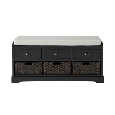 This Wood Storage Bench with Drawers and Baskets is a stylish and functional solution for organizing your entryway, mudroom, or walk-in closet. The cushioned seat ensures comfort, while three drawers and three baskets maximize storage capabilities, keeping your home organized and clutter-free. Whether it's hats and gloves, shoes, or toys, the baskets keep items within arm's reach but out of sight. The bench is assembled before delivery, allowing you to use it immediately upon receipt for added convenience and speed. Made from solid and manufactured wood, this bench can be easily cleaned with a quick wipe of a dry cloth.