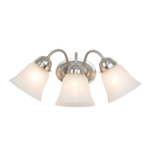 Update your bathroom decor with the stylish Yosemite 3-Light Bathroom Vanity in satin nickel. This simple but attractive vanity light fixture boasts an oval metal base and three curved arms in silver satin nickel. Three white frosted glass shades in a subtle bell shaped offer ample light. Requires 3 100 watt incandescent bulbs, sold separately.