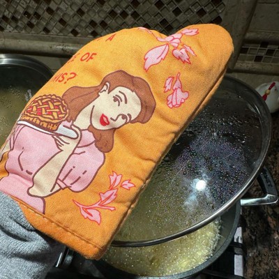 [This review was collected as part of a promotion.] I love kitschy kitchen accessories and laughed out loud when I saw this oven mitt. The funny phrase with a proper looking fifties housewife is a perfect addition to my kitchen. It’s made of heavy cotton and works great as a simple pot holder. It provides protection while handling hot items, but doesn’t provide the same heat resistance as a silicone mitt. It’s a decent value if you want a cute and funny kitchen accessory but, I would use caution when handling high heat for extended time because heat can transfer quickly to your hand.