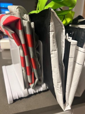 [This review was collected as part of a promotion.] I love having reusable bags for grocery shopping, but somehow they always ended up as mess in the corner of my pantry. This organizer works great to keep them in place and looking more tidy. I also like that it has a soft material on the bottom to keep from scratching our wood floors.