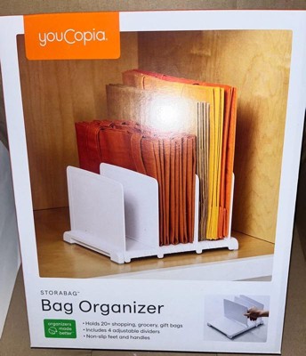 [This review was collected as part of a promotion.] This bag organizer is great! We had an abundance of paper bags laying on a shelf, and this organizer helped to tidy them up in no time. The plastic shelves are very durable, and the rubber surface makes sure it stays in place.