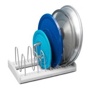 - Sturdy base prevents round lids from rolling while non-slip feet keep rack in place