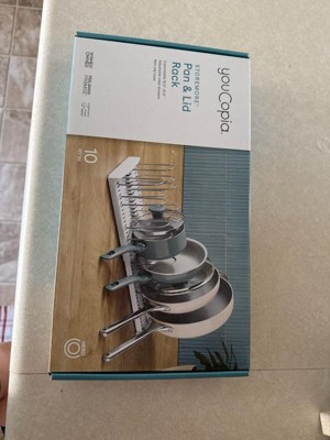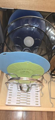 [This review was collected as part of a promotion.] This pan lid rack is very handy and helps organize even in the smallest of spaces. It’s adjustable so that you can use it for small skillets as well as lids, very space saving. I would recommend this to anyone even with large or small kitchens.