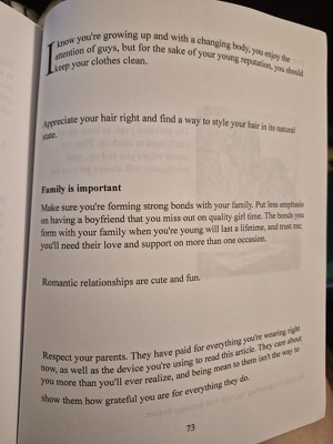 Most likely written by AI, Concerning messages, and not edited. multiple factual errors and the AI got confused by menstraul cycle and bicycle(lol). The writing doesnt seem to know if the audience is the child or parent at times. Certain terms are not defined for the child(genitalia). Opinions present as facts(if you have a larger bust you must wear a bra to sleep) . The only thing it had going for it was the diagram of external gentialia which many other books seem to lack. Paragraphs will end on a comma with a large blank space before the next line. large blank areas between text that have no purpose except to take up space but not in a visually appealing way. AI images(at least some) which im neutral on. Some of the typography(font) is unreadable. last couple pages have these notable quotes "I know you're growing up and with a changing body, you enjoy the attention of guys, but for the sake of yiur young reputation, you should keep your clothes clean" "Boys mature at a slower rate than girls. Also, your body will draw attention to you". this book is for 8-12 year olds. gross. this is a self published book with no author information other than name. it seems direct print from Ingram spark.