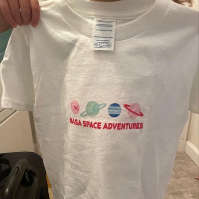 With this short-sleeve t-shirt from NASA, your little one will be ready for any space adventure. The graphic print displays colorful artwork of various planets and a text design which reads: ?NASA Space Adventures?. The direct-to-garment printing technology used on this tee produces an image with sharper detail. Keep your child cool on hot sunny days with this tee?s short-sleeve design. The lightweight and breathable cotton will feel gentle on your kid?s skin. This piece of apparel is literally out of this world, making it the perfect addition to your child?s clothing collection.