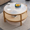 Yukimo 35"W Double-Layer Solid Wood Round Table - Horizontal Striped Glass Top, Imitation Rattan Lower Layer, Polished Anti-Scratch Design