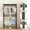 The Yukimo Rolling Clothes Rack offers a practical and stylish storage solution for any home. Designed with versatility in mind, this freestanding organizer includes three adjustable wire shelves, two clothes rails, and convenient side hooks to neatly store everything from dresses and jackets to shoes, bags, and accessories. Crafted from robust carbon steel and finished with a durable black coating, it resists scratches and is easy to clean. The smooth-rolling 360° wheels provide effortless mobility, while the flexible shelf and rail heights adapt to your storage requirements. Whether used in the bedroom, closet, or laundry area, this rack helps declutter your space efficiently. Simple to assemble and built to last, the Yukimo Rolling Clothes Rack combines functionality with reliable design for everyday organization.
