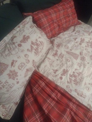 - THE YULETIDE DESIGN: One of our most popular sets, Yuletide is classic holiday. The front is a mix of holiday icons, sayings and phrases in red script on a cream ground and the reverse is a red, white and green plaid. The comforter is filled with soft, hypoallergenic 100% polyester.