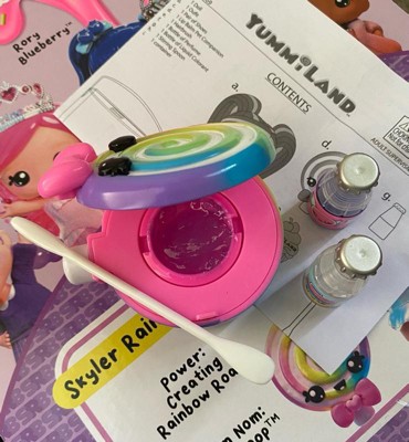 Skyler Rainbow Belt lives in Yummiland with her team of fellow adventure-seeking Yummis where her special lip gloss gives her a unique superpower! Play along at home with your large Skyler Rainbow Belt doll and her Num Nom Swirlypop by creating your own sweetly-scented lip gloss!