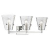Beginning with a tastefully minimalist brushed nickel finish steel frame, this chic three-light vanity bath light is a superb choice for adding elegance and ambient lighting. Crowning a custom vanity, this fixture from the Analia collection brings a bit of nautical charm with a trio of conical shades fashioned of clear textured glass. Choose this three-light vanity light to dress up a contemporary or transitional ensuite or guest bath.