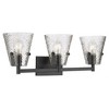 Beginning with a tastefully minimalist brushed nickel finish steel frame, this chic three-light vanity bath light is a superb choice for adding elegance and ambient lighting. Crowning a custom vanity, this fixture from the Analia collection brings a bit of nautical charm with a trio of conical shades fashioned of clear textured glass. Choose this three-light vanity light to dress up a contemporary or transitional ensuite or guest bath.