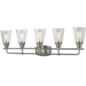 Harmony of vintage style fixture, clear glass, and vintage bulb shapes define the Annora family. Clear glass paired with brushed nickel fittings complete the look. Bathroom/Powder Room Mounting Direction: Up/Down Shade Included: Yes Dimmable: Yes Material: Glass, Finish Color: Brushed Nickel, Width: 36.75", Height: 10.75", Length: 6", Depth: 6", Backplate Width: 4.5", Backplate Length: 7", Lamping Type: Incandescent, Number Of Bulbs: 5, Wattage: 100 Watts, Dimmable: Yes, Moisture Rating: Damp Rated