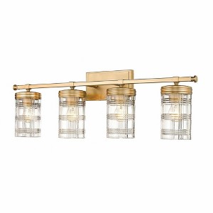 Create a classical-designed master bathroom with this sophisticated transitional four-light vanity wall sconce. Four cut crystal-inspired cylinder glass shades elevate vanities into an old-world restoration-inspired dressing area, elevated by a charming Glen plaid pattern around the glass that creates a glowing scintillation. A shiny brushed nickel finish pushes the metropolitan glam feel to a bathroom interior, making this four-light vanity fixture a stunning addition to spacious vanities and tablescapes.