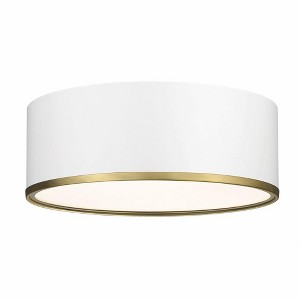 Bold and modern defines this flush mount, which features a two toned metal shade and stepped diffuser. Its bold but understated style makes this a versatile modern ceiling light fixture for any room in your home. Room Recommendation: Bedroom/Dining Room/Foyer/Hallway/Kids Room/Kitchen/Living Room/Office/Utility Room Shade Included: Yes Dimmable: Yes Material: Steel, Finish Color: Matte White/Rubbed Brass, Width: 16", Height: 6", Length: 16", Hanging Method: Flush, Lamping Type: Incandescent, Number Of Bulbs: 3, Wattage: 60 Watts, Dimmable: Yes, Moisture Rating: Damp Rated