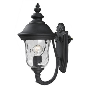 Traditional charm emanates from this small outdoor wall mount fixture, which pairs clear water glass with black hardware for a timeless look. Outdoor Living Shade Included: Yes Dimmable: Yes Material: Aluminum, Finish Color: Black, Width: 8", Height: 15.75", Length: 10.375", Depth: 10.38", Backplate Width: 10.5", Backplate Length: 4.5", Lamping Type: Incandescent, Number Of Bulbs: 1, Wattage: 100 Watts, Dimmable: Yes, Moisture Rating: Wet Rated