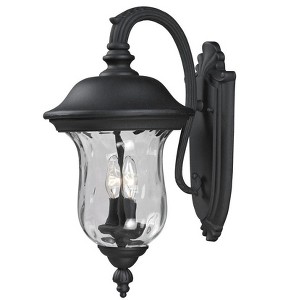 Traditional charm emanates from this medium outdoor wall mount fixture, which pairs clear water glass with black hardware for a timeless look. Outdoor Living Shade Included: Yes Dimmable: Yes Material: Aluminum, Finish Color: Black, Width: 10", Height: 19.5", Length: 12.8", Depth: 12.8", Backplate Width: 14", Backplate Length: 5.25", Lamping Type: Incandescent, Number Of Bulbs: 2, Wattage: 60 Watts, Dimmable: Yes, Moisture Rating: Wet Rated