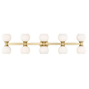 Dazzle a modern or transitional setting with custom lighting in the form of a 10-light vanity light perfect for both ensuites and guest bath spaces. From the Artemis collection comes a fun redo of Mid-Century Modern style in a linear brushed nickel finish steel frame and center curved holders clinging to delicate matte opal glass globe shades. Adding both uplighting and down lighting that crowns a spacious vanity, this transitional vanity light becomes a focal point.