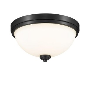 The graceful sweeping arms of the fixture synchronized with the elegant curves of the matte opal shades gives the Ashton family a classic yet contemporary presence. Bedroom/Dining Room/Foyer/Hallway/Kids Room/Kitchen/Living Room/Office/Utility Room Shade Included: Yes Dimmable: Yes Material: Glass, Finish Color: Bronze, Width: 13", Height: 6.5", Length: 13", Hanging Method: Flush, Lamping Type: Incandescent, Number Of Bulbs: 2, Wattage: 60 Watts, Dimmable: Yes, Moisture Rating: Damp Rated