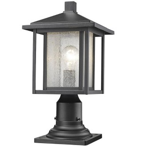 With its sturdy dual frames encasing uniqueseedy glass panels, the Aspen collection exudes a classic craftsmen style that is bold yet charming. Available in Black or Oil Rubbed Bronze, these fixtures will accent any outdoor setting. Room Recommendation: Outdoor Living/Deck/Patio Dimmable: Yes Shade Included: Yes Material: Glass, Finish Color: Black, Width: 9", Height: 16.75", Fitter Size: 3 Inch", Lamping Type: Incandescent, Number Of Bulbs: 1, Wattage: 100 Watts, Dimmable: Yes, Moisture Rating: Wet Rated