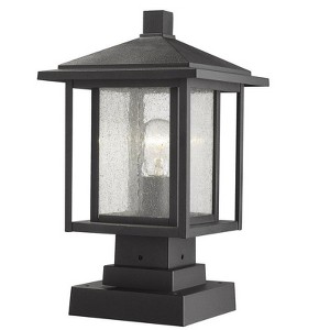 Watch an exterior landscape come to life with the addition of this elegant oil rubbed bronze finish pier mounted fixture. Featuring a dynamic aluminium dual frame, its seedy glass shade adds a perfect finishing touch and a ton of contemporary personality. Outdoor Living/Deck/Patio Shade Included: Yes Dimmable: Yes Material: Glass, Finish Color: Black, Width: 9", Height: 16", Length: 9", Fitter Size: 3 Inch", Lamping Type: Incandescent, Number Of Bulbs: 1, Wattage: 100 Watts, Dimmable: Yes, Moisture Rating: Wet Rated