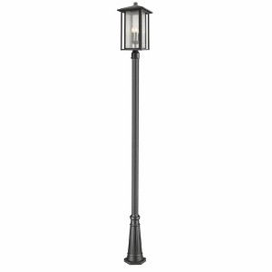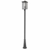 Artistic styling adds a traditional feel to this black finish three-light outdoor post mounted fixture. Durable aluminium forms a sturdy body and a dual frame accentuating a seedy glass shade and a candelabra-style bulb base. Outdoor Living/Deck/Patio Shade Included: Yes Dimmable: Yes Material: Glass, Finish Color: Black, Width: 11", Height: 118.44", Length: 11", Fitter Size: 3 Inch", Lamping Type: Incandescent, Number Of Bulbs: 3, Wattage: 60 Watts, Dimmable: Yes, Moisture Rating: Wet Rated