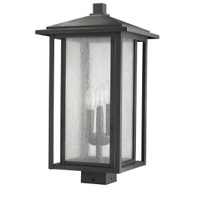 Add a craftsman-inspired nod to exterior lighting with this three-light outdoor post mount fixture. Gorgeous oil rubbed bronze offers a rich finish to a durable aluminium dual frame, while a seedy glass shade delivers a dramatic nest for a candelabra-style bulb base. Outdoor Living/Deck/Patio Shade Included: Yes Dimmable: Yes Material: Glass, Finish Color: Black, Width: 11", Height: 20.87", Length: 11", Lamping Type: Incandescent, Number Of Bulbs: 3, Wattage: 60 Watts, Dimmable: Yes, Moisture Rating: Wet Rated