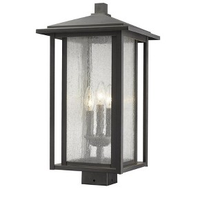 Add a craftsman-inspired nod to exterior lighting with this three-light outdoor post mount fixture. Gorgeous oil rubbed bronze offers a rich finish to a durable aluminium dual frame, while a seedy glass shade delivers a dramatic nest for a candelabra-style bulb base. Outdoor Living/Deck/Patio Shade Included: Yes Dimmable: Yes Material: Glass, Finish Color: Black, Width: 11", Height: 20.87", Length: 11", Lamping Type: Incandescent, Number Of Bulbs: 3, Wattage: 60 Watts, Dimmable: Yes, Moisture Rating: Wet Rated