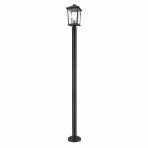 Customize a walkway or patio area with the charming look of this black outdoor light. Statuesque and ornate, its village theme design beautifies an exterior living space and spruces up the overall ambiance of a home. Outdoor Living/Deck/Patio Shade Included: Yes Dimmable: Yes Material: Aluminum, Finish Color: Black, Width: 9.5", Height: 83", Fitter Size: 3 Inch", Lamping Type: Incandescent, Number Of Bulbs: 2, Wattage: 60 Watts, Dimmable: Yes, Moisture Rating: Wet Rated