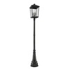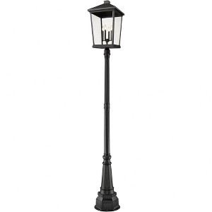 Custom crafting delivers a sophisticated village-inspired look to outdoor spaces, making this four-light outdoor post-mounted fixture from the Beacon collection a superb choice. Dress up a patio or walkway with a fixture crafted of matte black finish aluminum and clear beveled glass, with charming candelabra-style bulb mounts adding a romantic aesthetic. Nestled on an ornate, detail-oriented post, this light fixture adds elegance to any exterior space. Dimmable: Yes Shade Included: Yes