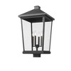 The Beacon collection offers this classic, stylish four-light outdoor post mount fixture to customize a sophisticated ensemble of patio, deck, or walkway spaces. Crafted of matte black finish aluminum, its house-like form features a traditional silhouette with clear beveled glass panels and a charming bulb mount unit that's ideal for romantic candelabra-style bulbs. Dimmable: Yes Shade Included: Yes