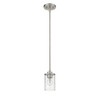 An air of simplicity creates sophistication and style in a modern or transitional space when this one-light mini-pendant shows off its classic elegance. This mini-pendant from the Beckett collection reflects a hint of nautical influence, blending a brushed nickel finish steel mount and down rod with a single cylindrical clear seedy glass shade. Bring ambient lighting to a targeted space, illuminating a dinette set, hallway, or breakfast nook. Cord Length: 110.00 Rod Length(s): 1-3, 1-6, 6-12 Dimmable: Yes Shade Included: Yes