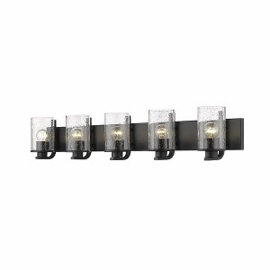 A modern version of nautical charm makes its way into this five-light vanity light from the Beckett collection, adding a pleasing touch to any space. Larger bath areas light up with this vanity light fashioned of bright chrome finish steel with a rectangular wall mount and charming accents. Clear seedy glass shades in cylindrical form offer a delicate, natural infusion of romance. Dimmable: Yes Shade Included: Yes