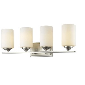 The circular base and the waterfall arms of the Bordeaux family is modernized by the soft matte opal shades which is paired with bronze fittings. Bathroom/Powder Room Mounting Direction: Up/Down Shade Included: Yes Dimmable: Yes Material: Glass, Finish Color: Brushed Nickel, Width: 24", Height: 8.5", Length: 6", Depth: 6", Backplate Width: 4.75", Backplate Length: 7.25", Lamping Type: Incandescent, Number Of Bulbs: 4, Wattage: 100 Watts, Dimmable: Yes, Moisture Rating: Damp Rated