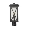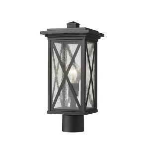 This one-light outdoor post mounted fixture comes in a box-shaped black aluminum cage with a rounded post attachment. Its clear seedy glass finish softly diffuses light to provide a welcoming glow to your front entrance or patio. Compelling X-accents bring dimension and character. Outdoor Living/Deck/Patio Shade Included: Yes Dimmable: Yes Material: Glass, Finish Color: Black, Width: 7.5", Height: 16.5", Length: 7.5", Lamping Type: Incandescent, Number Of Bulbs: 1, Wattage: 100 Watts, Dimmable: Yes, Moisture Rating: Wet Rated