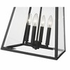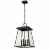 Soften a crisp modern vibe with the benefit of iconic village nautical styling in an exterior light. This four-light outdoor chain mount ceiling fixture creates a romantic feel with candelabra bulb mounts visible from an angled lantern-style black aluminum frame with clear beveled glass panels. Material: Aluminum, Finish Color: Black, Width: 12.5", Height: 19.5", Length: 12.5", Hanging Method: Chain, Chain Length: 72", Lamping Type: Incandescent, Number Of Bulbs: 4, Wattage: 60 Watts, Dimmable: Yes, Moisture Rating: Damp Rated